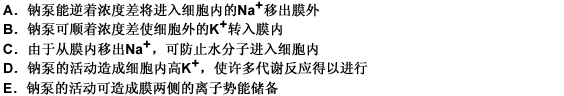 以下关于钠泵生理作用的叙述 哪项是错误的 A.钠泵能逆着浓度差将进入细胞内的Na+移出膜外 B.
