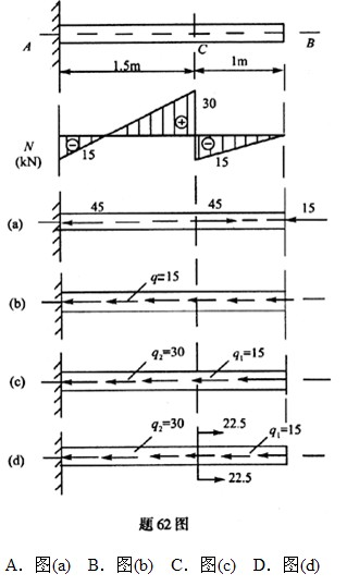 已知图示等直杆的轴力图(N图) 则该杆相应的荷载图如下列何项所示?(图中集中荷载单位均为kN 分布
