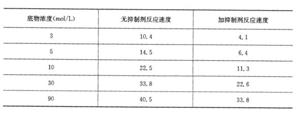 在一酶促反应体系中,根据抑制剂的存在(2 mol/L)和缺失,加入不同浓度的底物后反应速度如下表: