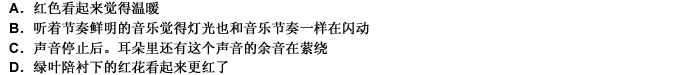 ()的现象属于联觉现象。A.红色看起来觉得温暖B.听着节奏鲜明的音乐觉得灯光也和音乐节奏一样在闪