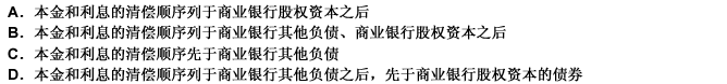 关于商业银行次级债券的论述,正确的是()。 A.本金和利息的清偿顺序先于商业银行其