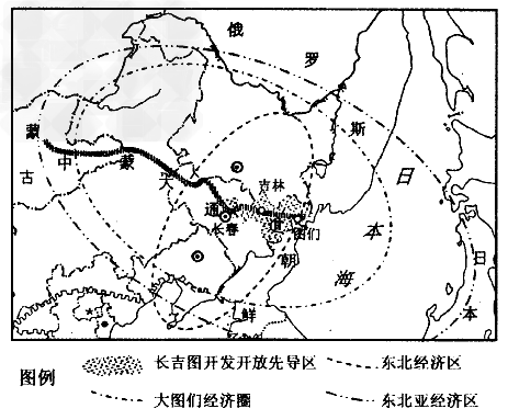 根据材料回答下列问题。材料一:“长吉图开发开放先导区”以长春、吉林和图们江一带为核心,中蒙大通道横贯其中,向外辐射东北经济区、大图们江经济圈和东北亚经济区,建成后有望成为我国乃至东北亚地区一个新的经济增长极。