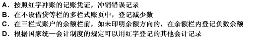 下列情况不可以用红色墨水记账的是( )。 A.冲账的记账凭证 冲销错误记录 B.在不设借贷等栏的多栏