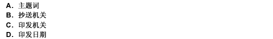 下列若干公文要素中,属于版记部分的是()。A) 主题词 B) 题注 C) 附件 D) 成文日期