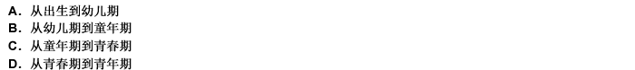 第一发展加速期是指( )。(A)从出生到幼儿期 (B)从幼儿期到童年期(C)从童年期到青春期 (D