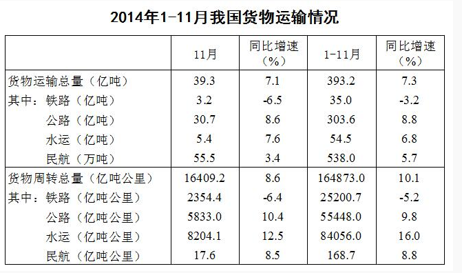 关于2014年1~11月我国货物运输状况 能够从上述资料中推出的是:A.月均货物运输量约为33亿吨B.每吨