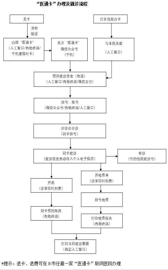 下列是B市人民医院门诊大厅张贴的“医通卡”办理及就诊流程图: