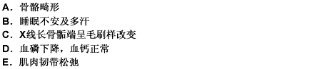 维生素D缺乏性佝偻病后遗症期的临床表现是A.方颅,肋骨串珠,鸡胸或漏斗胸B.多汗,夜惊,易激惹,枕秃